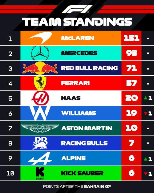 Παρά τη δεύτερη θέση του George Russell, η Mercedes (που είχε όμως τον Andrea Kimi Antonelli εκτός βαθμών), παραμένει δεύτερη αν και πλέον εκτός απόστασης βολής: στους 93 βαθμούς.