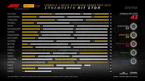 Οι Leclerc και Verstappen ακολούθησαν πανομοιότυπη στρατηγική: Εκκίνησαν με την P Zero κίτρινη/μέση γόμα και μετά έβαλαν δυο σετ σκληρής γόμας. Στο φινάλε χρησιμοποίησαν τη μέση γόμα εκμεταλλευόμενοι την παρουσία του εικονικού αυτοκινήτου ασφαλείας.