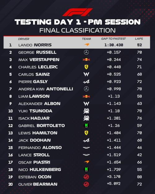 Με την πρώτη ημέρα να έχει στην κορυφή την ομάδα που έκλεισε το 2024 στην κορυφή – την McLaren. Η καλύτερη επίδοση ανήκε στον Lando Norris, που στο απογευματινό μέρος των δοκιμών, υπό το φως των προβολέων, κάλυψε τα 5412 μέτρα της αγωνιστικής διαδρομής με χρόνο 1:30.430.