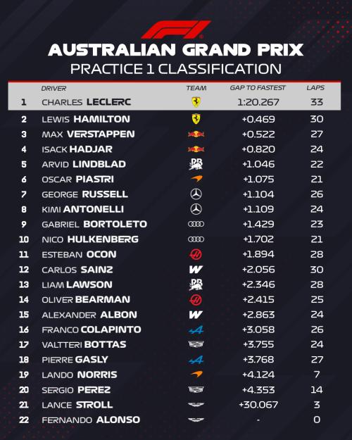 Ακολούθησαν οι δύο Mercedes, ένα δευτερόλεπτο μακριά από τον Leclerc και με τους George Russell και Andrea Kimi Antonelli να κάνουν σχεδόν τον ίδιο χρόνο. Ήταν ξεκάθαρο πως η γερμανική ομάδα ακόμα κρύβει την πραγματική της δυναμική.