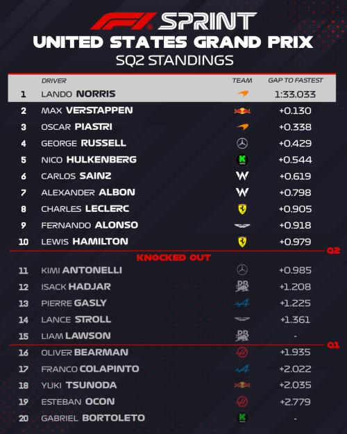 Στο SQ1 δεν είχαμε απρόοπτα. Οι McLaren έκαναν το 1-3 με τον Norris στην κορυφή χάρη σε επίδοση στο 1:33.224 και τον Verstappen ανάμεσά τους με τη Red Bull. Μάλιστα ο Ολλανδός ήταν μόλις ένα δέκατο του δευτερολέπτου πίσω από τον Βρετανό, την ώρα που ο Piastri ήταν στα έξι δέκατα. Όσο για τη ζώνη αποκλεισμού, εκεί βρέθηκαν οι δύο οδηγοί της Haas F1, ο Franco Colapinto με την Alpine, ο Yuki Tsunoda που απογοήτευσε ξανά για τη Red Bull μπλέκοντας στην κίνηση και ο Gabriel Bortoleto με την Kick Sauber, που δεν έγραψε καν χρόνο αφού ο πρώτος του ακυρώθηκε και στη συνέχεια δεν μπόρεσε να ξεκινήσει εγκαίρως νέα προσπάθεια.