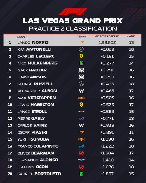 Υπαίτιος ήταν ο Leclerc, που είχε πρόβλημα με το κιβώτιο της Ferrari SF-25, την οποία και πάρκαρε σε μία έξοδο διαφυγής. Ο Norris έκλεισε τη δεύτερη περίοδο ελεύθερων δοκιμών στην κορυφή, με τον Kimi Antonelli της Mercedes μόλις 29 χιλιοστά του δευτερολέπτου πιο αργό, τον Leclerc τρίτο και τη Sauber του Nico Hulkenberg να είναι μπροστά από τις δύο Racing Bulls.