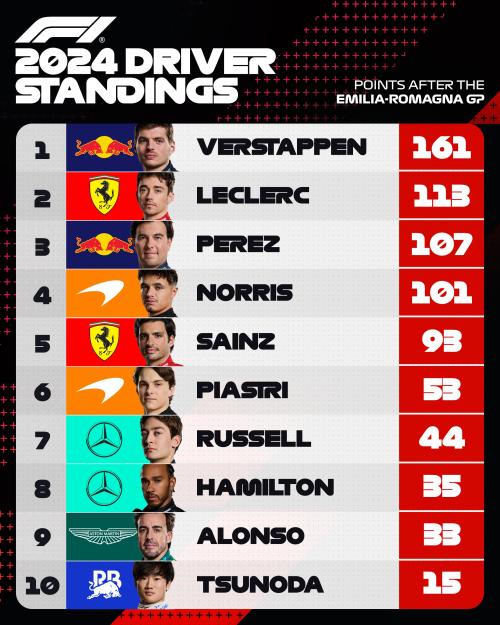 Ο σταθερός φέτος Charles Leclerc της Ferrari, παρότι τρίτος στην Ίμολα, κατάφερε να περάσει στη δεύτερη θέση της βαθμολογίας των οδηγών. Αντίθετα, η χαμηλή πτήση του Sergio Perez της Red Bull Racing, τον ανάγκασε να υποχωρήσει μία θέση.