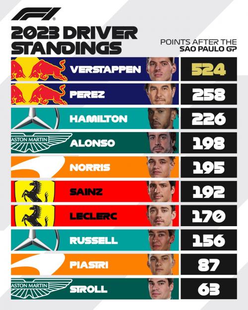 Την ώρα που Max Verstappen συνέχιζε το ίδιο βιολί κατακτώντας τη νίκη και στο Γκραν Πρι του Sao Paulo, τα αποτελέσματα στη Βραζιλία κρατούν ανοιχτές τις μάχες για τις θέσεις 2-8.