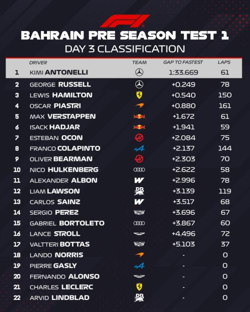 Τα ασημί βέλη κυριάρχησαν στην τρίτη και τελευταία ημέρα του πρώτου τεστ που διεξάγεται στην πίστα του Σακχίρ, στο Μπαχρέιν.