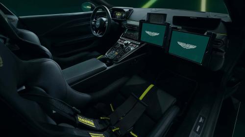 Φυσικά, το εσωτερικό διαφέρει πολύ από εκείνο της απλής Vantage. Τα καθίσματα έχουν αντικατασταθεί από bucket Recaro Pole Position, ενώ η κεντρική κονσόλα έχει τροποποιηθεί βάσει των απαιτήσεων του ρόλου του οχήματος: με πληθώρα κουμπιών που αφορούν τα συστήματα της FIA αλλά και δύο οθόνες μπροστά από τον συνοδηγό, που προβάλλουν δεδομένα GPS για τη θέση των μονοθεσίων στην πίστα, χρόνους αλλά και την εικόνα από την κάμερα που κοιτά στο πίσω μέρος του SC.