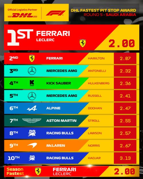 Από την άλλη, η Scuderia Ferrari είχε μία αξιοσημείωτη πρωτιά. Ή καλύτερα, πέτυχε ένα αξιοσημείωτο 1-2! Ο λόγος για τα pit stop, όπου η ιταλική ομάδα είχε τα δύο ταχύτερα του πέμπτου αγώνα του 2025!