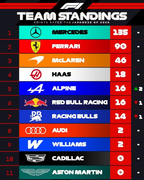 Audi και Williams παραμένουν χαμηλά ενώ Cadillac και Aston Martin παραμένουν στο μηδέν. Αναλυτικά η βαθμολογία μετά τους πρώτους τρεις αγώνες της φετινής σεζόν: