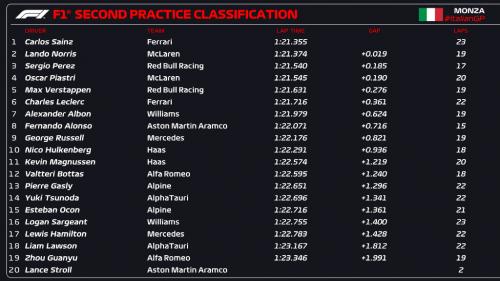 Προς τέρψη των χιλιάδων tifosi, ο Ισπανός έγραψε χρόνο 1.21.355 και επικράτησε στο FP2 – έστω και για 19 χιλιοστά του δευτερολέπτου! Πίσω από τον Carlos Sainz ήταν το φιλαράκι του, ο Lando Norris με τη McLaren.