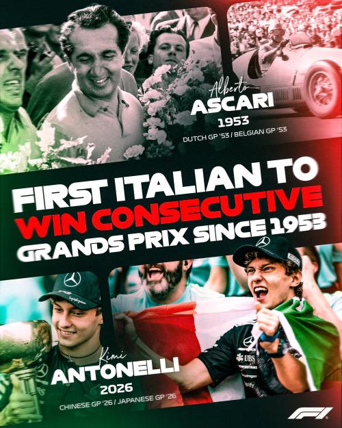 Ο Antonelli έγινε ο πρώτος Ιταλός που πανηγύρισε νίκη σε συνεχόμενα Grand Prix εδώ και 73 χρόνια! Συγκεκριμένα, από τη σεζόν του 1953, όταν ο Alberto Ascari είχε πανηγυρίσει στα Grand Prix Ολλανδίας και Βελγίου.
