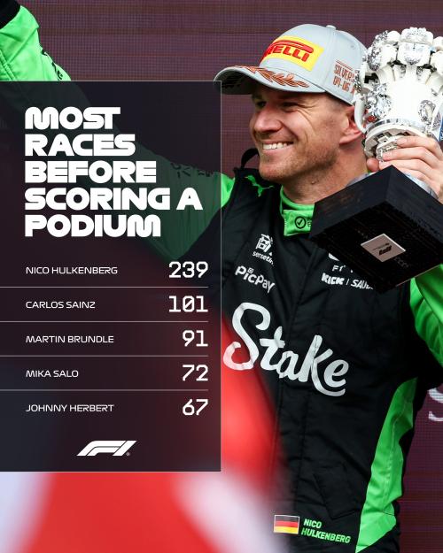 Σε αυτή τη λίστα δεν είναι πια στην κορυφή ο Carlos Sainz που χρειάστηκε 101 εκκινήσεις (έχει πια 27 βάθρα) ενώ ακολουθούν ο Martin Brundle με 91 (σταμάτησε στα 9 βάθρα), ο Mika Salo με 72 για να πανηγυρίσει το πρώτο εκ των δύο πλασαρισμάτων του στο βάθρο και ο Johnny Herbert με 67 (συνολικά είχε 7 Top-3 τερματισμούς).