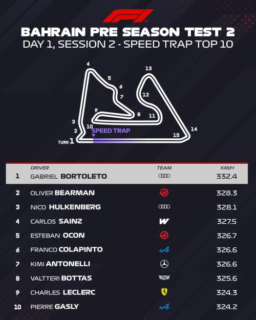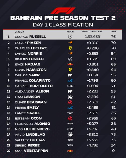 Ταχύτερος όλων ήταν ο George Russell με τη Mercedes-AMG W17 E Performance, που σταμάτησε τα χρονόμετρα το απόγευμα στο 1:33.459. Επίδοση που είναι η καλύτερη που έχουμε δει έως τώρα στις δοκιμές εξέλιξης του Μπαχρέιν, αφού ήταν δύο δέκατα κάτω από τον καλύτερο χρόνο του τεστ της προηγούμενης εβδομάδας – που ανήκε πάλι στη γερμανική ομάδα αλλά τον Kimi Antonelli. Πρέπει επίσης να σημειωθεί πως και οι δύο επιδόσεις, ήταν με τη C3 γόμα της Pirelli.