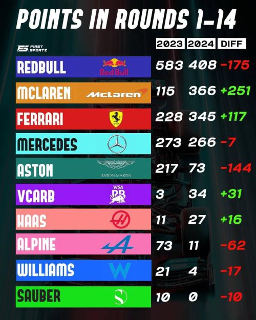 Η πιο βελτιωμένη ομάδα προφανώς είναι η McLaren που είναι στο +251 σε σχέση με το αντίστοιχο σημείο της περυσινής σεζόν ενώ και η Scuderia Ferrari, παρότι έχει χάσει έδαφος στους τελευταίους γύρους, είναι στο +117.