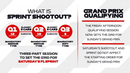 Όλα αυτά σε ένα νέο αγωνιστικό πρόγραμμα, με το Sprint Shootout να αποτελεί τη μεγάλη αλλαγή το Σάββατο. Με τρία μέρη: Q1, με διάρκεια 12 λεπτά, Q2 με διάρκεια 10 λεπτά και το τελικό Q3 με διάρκεια 8 λεπτά. Οι ομάδες είναι υποχρεωμένες να χρησιμοποιήσουν φρέσκα σετ ελαστικών και συγκεκριμένα τη μέση γόμα στο Q1 και Q2, και τη μαλακή στο Q3.
