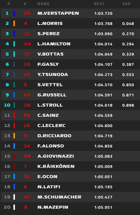 O Φερστάπεν άντεξε, τελικά, στην πίεση του Λάντο Νόρις και πήρε ακόμη μια Pole Position. Ο Πέρεζ, με την άλλη Red Bull βρέθηκε στην 3ή θέση, με τους Μπότας και Χάμιλτον να κλείνουν την πρώτη πεντάδα. Δυστυχώς, η στρατηγική της Ferrari δεν απέδωσε τα αναμενόμενα και οδήγησε τους Λεκλέρ και Σάινθ εκτός δεκάδας. Το GP Αυστρίας θα διεξαχθεί αύριο στις 16:00 ώρα Ελλάδος.