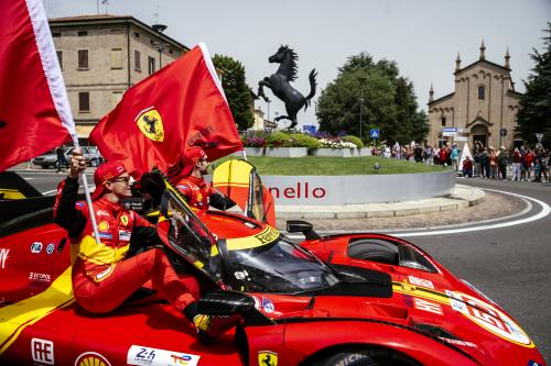 Οι δύο θηριώδεις 499P όργωσαν την πόλη, με τα δύο αγωνιστικά πληρώματα να στηρίζονται από τις ανοιχτές πόρτες και να κρατούν σημαίες της Ferrari.
