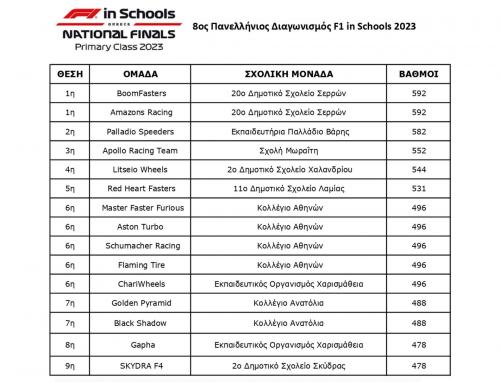 Με επιτυχία ολοκληρώθηκαν οι Εθνικοί Τελικοί του 8ου Πανελλήνιου Διαγωνισμού F1 in Schools 2023 για Δημοτικά. Oι αγώνες διενεργήθηκαν σε δύο μέρη: Το πρώτο στην Εράσμειο Ελληνογερμανική Σχολή στην Αθήνα και το δεύτερο στο Κολλέγιο Ανατόλια στη Θεσσαλονίκη.