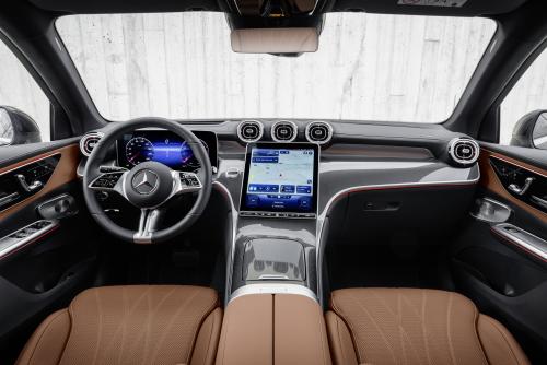 Η εικόνα στο εσωτερικό της νέας Mercedes-Benz GLC παραπέμπει σε εκείνο της C-Class, με την οθόνη αφής του προηγμένου infotainment να κυριαρχεί στην κεντρική κονσόλα.