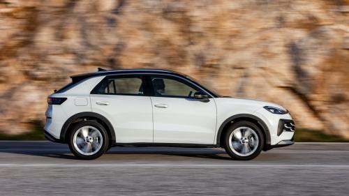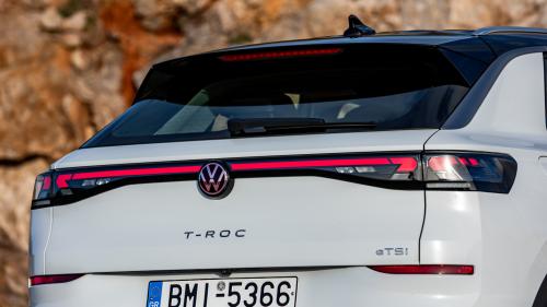 Στο πλάι, η γραμμή της οροφής έχει πιο έντονη κλίση, κάνοντας το T-Roc να δείχνει πιο δυναμικό χωρίς να θυσιάζεται η χρηστικότητα, ενώ οι τονισμένοι θόλοι και τα μαρσπιέ του δίνουν ένα πιο περιπετειώδες παρουσιαστικό, τη στιγμή που οι ζάντες 18 ιντσών της δοκιμής (έως 20 στον προαιρετικό εξοπλισμό) γεμίζουν σωστά το μάτι. Στο πίσω μέρος, η φωτεινή μπάρα που ενώνει τα LED φώτα και η πιο έντονα κεκλιμένη πόρτα του χώρου αποσκευών ολοκληρώνουν το πιο premium προφίλ της δεύτερης γενιάς.