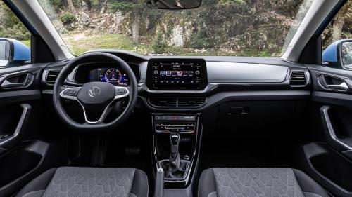 Το φρεσκάρισμα του T-Cross συνεχίζεται και στο εσωτερικό, όπου η εικόνα της ποιοτικής αναβάθμισης είναι αισθητή έναντι του προηγούμενου μοντέλου. Από τη μέση και πάνω το ταμπλό έχει ανασχεδιαστεί, με κυριότερες διαφορές, τους ανασχεδιασμένους αεραγωγούς και την οθόνη του συστήματος πολυμέσων που «ξεκόλλησε» από το ταμπλό και στέκεται πλέον μόνη της σε μια καλύτερη θέση και εργονομικά.