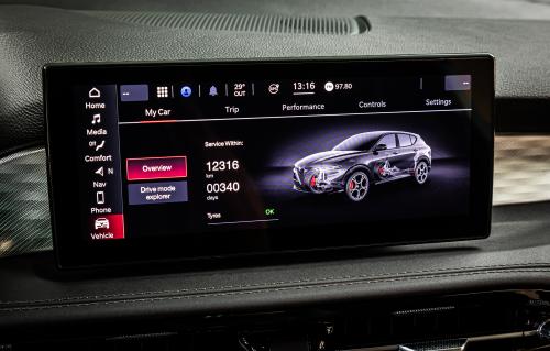 Ο πλήρως παραμετροποιήσιμος πίνακας οργάνων των 12,3 ιντσών θα μπορούσε να ισχυριστεί κανείς ότι επισκιάζει ακόμα και την κεντρικά τοποθετημένη οθόνη αφής των 10,25 ιντσών, όχι όμως και την άριστη εργονομία που έχει επιτευχθεί από τους Ιταλούς στο πιλοτήριο του αυτοκινήτου.