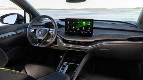 Τo Enyaq Coupe iV σε καλωσορίζει σε μια καμπίνα που επί της ουσίας δεν έχει διαφορές σε σχέση με εκείνη του στάνταρ SUV. Η αίσθηση ποιότητας και προσοχής στη λεπτομέρεια γίνεται αντιληπτή από την πρώτη στιγμή που θα βρεθεί κανείς στο εσωτερικό του τσέχικου ηλεκτρικού, πόσο μάλλον όταν αυτή αντιστοιχεί στην κορυφαία έκδοση RS. Εδώ, οι διαφορές με τις υπόλοιπες εκδόσεις εντοπίζονται πρωτίστως στις επενδύσεις, το διαφορετικής σχεδίασης σπορ τριάκτινο τιμόνι με το σήμα RS αλλά και στα σπορ καθίσματα με τα ενσωματωμένα προσκέφαλα. Τα τελευταία προσφέρουν μεγάλο εύρος ρύθμισης και σε συνδυασμό με το τιμόνι βοηθούν τον οδηγό να βρει πολύ γρήγορα τη θέση που του ταιριάζει, ανεξάρτητα από τον σωματότυπο του.