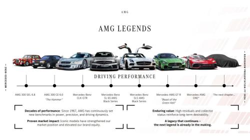 Το ηλεκτρικό hypercar AMG εμφανίστηκε στη διαρροή μιας παρουσίασης της Mercedes, με το σλόγκαν "The next legend is already in the works" ("Ο επόμενος θρύλος ήδη ετοιμάζεται"), δίπλα σε μοντέλα όπως το CLK GTR και οι Black Series. Παρότι η παρουσίασή του αναμένεται στους προσεχείς μήνες, όμως, τα πρώτα του αντίτυπα πιθανότατα δεν θα αρχίσουν να παράγονται πριν από το 2027.
