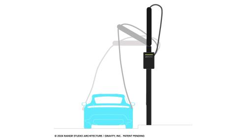Το “δέντρο φόρτισης”, όπως το αποκαλεί η Gravity, μπορεί να τοποθετηθεί στο πεζοδρόμιο χωρίς συμβιβασμούς στο χώρο για τους πεζούς. Το πλεονέκτημά του είναι, επίσης, ότι το καλώδιο φόρτισης κρέμεται από έναν εναέριο βραχίονα που περιστρέφεται, για την ευκολότερη τοποθέτησή του στην πρίζα του αυτοκινήτου.