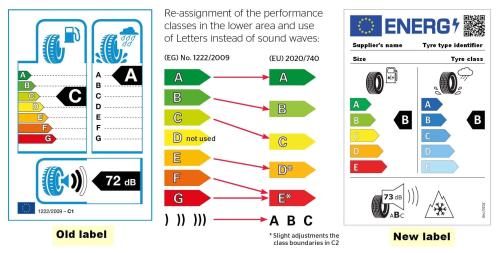 Η νέα ετικέτα που συνοδεύει από το 2021 τα ελαστικά που πωλούνται στην Ε.Ε. αναφέρει στοιχεία για την κατανάλωση καυσίμου με την οποία επιβαρύνουν το αυτοκίνητο (μέσω της αντίστασης κύλισης), το φρενάρισμα σε βρεγμένο, τον θόρυβο κύλισης και την πρόσφυση σε ακραίες συνθήκες χιονιού και πάγου.