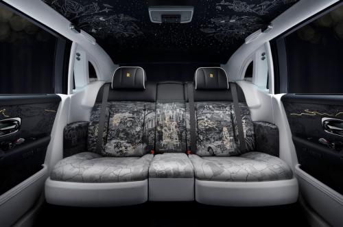 Τα πίσω καθίσματα αφηγούνται τρεις ιστορίες από το παρελθόν, συμπεριλαμβανομένης μιας απεικόνισης του εκθεσιακού χώρου της Rolls στην οδό Conduit Street, όπου παρουσιάστηκε η πρώτη Phantom, καθώς και έργων του Henry Royce από τη νότια Γαλλία. Η διαδικασία, εμπνευσμένη από τις τεχνικές ραφής του Savile Row, απαιτεί 45 ξεχωριστά πάνελ που ευθυγραμμίζονται σχολαστικά με το σχήμα των καθισμάτων.