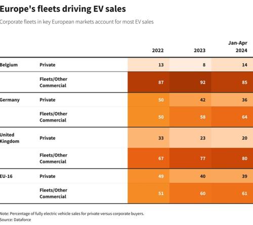 Σύμφωνα με στοιχεία που παρείχε στο Reuters η Dataforce, στις 16 ευρωπαϊκές αγορές όπου μπορεί να εντοπίσει ταξινομήσεις στόλων - συμπεριλαμβανομένων της Γερμανίας, της Βρετανίας, της Γαλλίας και της Ισπανίας - το 60% των νέων ηλεκτρικών οχημάτων προορίζονται για εταιρικούς στόλους και εμπορικούς αγοραστές. Οι ειδικοί λένε ότι αυτοί οι αγοραστές χρησιμοποιούν σχεδόν αποκλειστικά μισθώσεις και περίπου οι μισές από τις υπόλοιπες πωλήσεις σε ιδιώτες αγοραστές είναι επίσης μισθώσεις.