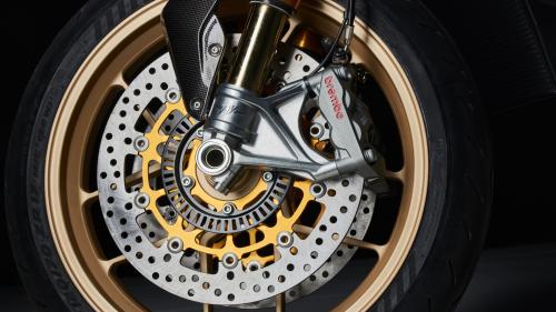 Το σύνολο ολοκληρώνεται με τα Pirelli Diablo Rosso IV, που εξασφαλίζουν κορυφαία πρόσφυση και προοδευτική αίσθηση στο όριο, αναδεικνύοντας πλήρως τη γεωμετρία και τη δυναμική του πλαισίου.
