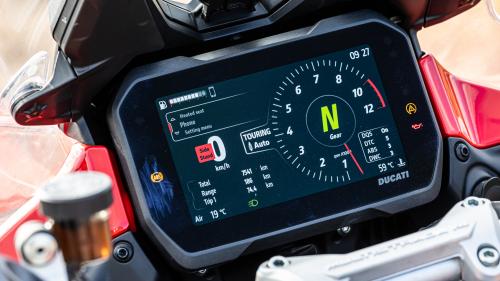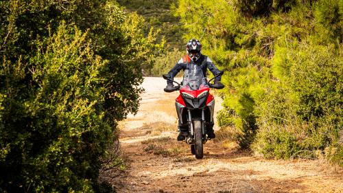 Με τη σωστή επιλογή προγράμματος οδήγησης, για τις αναρτήσεις και την απόκριση του κινητήρα και με σύμμαχο τον τροχό των 19 ιντσών, η μεγάλη ιταλική adventure δεν αντιμετωπίζει πρόβλημα σε κακοτράχαλο τερέν κρατώντας παράλληλα τον αναβάτη της ξεκούραστο. Η τεράστια παραμετροποίηση που προσφέρει η Multistrada της δίνει τη δυνατότητα να βγάζει σε κάθε συνθήκη το σωστό «πρόσωπο» και να προσαρμόζεται στις επιθυμίες του αναβάτη της με το απλό πάτημα των κουμπιών στο αριστερό γκριπ. Το τελευταίο δείχνει και είναι φορτωμένο με κουμπιά, καθώς από εκεί ελέγχονται σχεδόν τα πάντα και η εξοικείωση του αναβάτη με αυτό απαιτεί φυσιολογικά παραπάνω χρόνο από το σύνηθες.