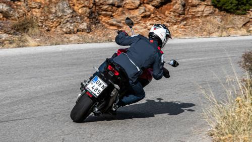 Αυτό που ίσως δεν περιμένει ο αναβάτης είναι ο τρόπος που η Multistrada συνεχίζει με τον ίδιο ρυθμό και όταν εγκαταλείψει τον αυτοκινητόδρομο και βρει μπροστά της τις πρώτες αξιόλογες στροφές. Εκτός βέβαια και αν έχει οδηγήσει την προηγούμενη δικύλινδρη γενιά… Παρά πλέον την απουσία του 17άρη εμπρός τροχού και την αντικατάσταση του με αυτόν των 19 ιντσών, η Multistrada V4 S Sport με τους χυτούς αλουμινένιους τροχούς υπακούει στις ορέξεις του αναβάτη που εκμεταλλεύεται χωρίς φόβο τον πανίσχυρο κινητήρα για να εκτοξευτεί από στροφή σε στροφή. Παρά τα 240+ γεμάτα κιλά, η ιταλική μοτοσικλέτα αλλάζει κατεύθυνση με χαρακτηριστική ευκολία και κρατά πιστά την τροχιά που χαράσσει ο αναβάτης, στον οποίο δεν θα λείψει αισθητά η μικρότερη αδράνεια που προσέφερε ο 17άρη τροχός της προηγούμενης γενιάς Ίσως ούτε και η όποια επιπλέον πρόσφυση με όφελος το ακόμη πιο προοδευτικό γλίστρημα στους ελληνικής ποιότητας δρόμους που δίνει τον απαραίτητο χρόνο αντίδρασης για διορθώσεις.
