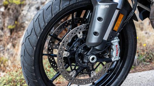 Τα φρένα από την άλλη φαίνεται να υπολείπονται ελαφρώς σε δύναμη, πάντα σε σχέση με τις προδιαγραφές τους και όχι με το τελικό αποτέλεσμα, αφού οι ακτινικά τοποθετημένες 4πίστονες δαγκάνες Stylema της Brembo, σε συνδυασμό με την ακτινική τρόμπα και τους δίσκους των 330 χλστ. δεν αφήνουν περιθώριο αμφισβήτησης. Το επιθυμητό αποτέλεσμα έρχεται με λίγη παραπάνω πίεση στη μανέτα, με ένα μέρος της ακρίβειας να έχει θυσιαστεί στο ασφάλτινο κομμάτι για την πολύ καλή απόδοση του συστήματος σε δρόμο με σαθρό τερέν. Εκεί το σύστημα πέδησης έχει την αίσθηση και τη γραμμικότητα που χρειάζεται για να κινηθεί κάποιος απρόσκοπτα, με την Multistrada να δείχνει και σε αυτό το τερέν τις δυνατότητες της.