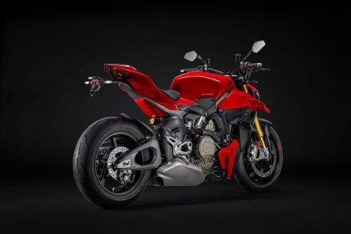 Επιπλέον, το κοίλο συμμετρικό ψαλίδι διπλής όψης Ducati, βελτιώνει την πρόσφυση κατά την έξοδο από τις στροφές και την αίσθηση του αναβάτη κατά την επιτάχυνση, με μείωση της πλευρικής ακαμψίας (-43% σε σύγκριση με το μονόπλευρο ψαλίδι του προηγούμενου μοντέλου) και συνολική ελάφρυνση όλου του πίσω μέρους της μοτοσικλέτας, ίση με 2,9 kg. Στη Streetfighter V4 S, οι σφυρήλατες ζάντες αλουμινίου με πέντε ακτίνες, εμπνευσμένες από αυτές του DesmosediciGP, ζυγίζουν μόνο 2,95kg και 4,15 kg αντίστοιχα, εμπρός και πίσω.