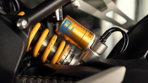 Ίδιο έχει παραμείνει και το αλουμινένιο πλαίσιο με το μεταξόνιο να φτάνει στα 1.439 χλστ., το ίχνος στα 104,7 χλστ. και την κάστερ στις 23,9 μοίρες. Σημείο που θα κάνει τη μεγάλη διαφορά είναι η τοποθέτηση των ηλεκτρονικά ελεγχόμενων αναρτήσεων Öhlins Smart EC 2.0 (επαναφορά και συμπίεση), οι οποίες έχουν ρυθμιστεί σύμφωνα με τη γεωμετρία της βρετανικής μοτοσυκλέτας, με πιρούνι 43 χλστ. εμπρός και διαδρομές 120 χλστ. και για τους δύο τροχούς. Το «πακέτο» συμπληρώνεται από τις ακτινικά τοποθετημένες δαγκάνες Stylema της Brembo που συνεργάζονται με δίσκους 320 χλστ.