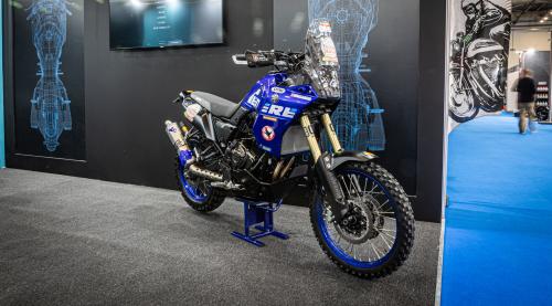 Στο περίπτερο του carandmotor.gr φιλοξενούνται τρία δίτροχα και αναμφίβολα το πιο εντυπωσιακό από αυτά, εκείνο που μαγνητίζει περισσότερο τα βλέμματα είναι η ειδικά προετοιμασμένη για αγώνες τύπου Rally Raid, Yamaha Tenere 700.