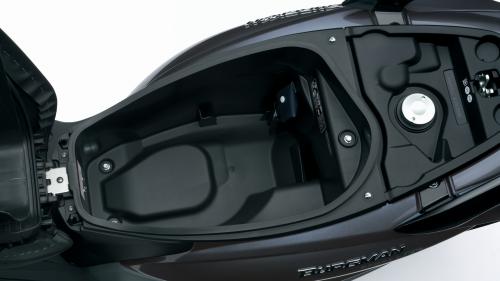 Χώρος υπάρχει φυσικά και κάτω από τη σέλα και με χωρητικότητα που φτάνει στα 21,5 λίτρα μπορεί να φιλοξενήσει μεγαλύτερα σε διαστάσεις αντικείμενα. Για την αποθήκευση των κρανών, όταν το Burgman δεν κινείται, η Suzuki έχει προβλέψει με την τοποθέτηση δύο ακόμη γαντζών κάτω από τη σέλα στο εμπρός μέρος της. Σε αυτούς μπορούν να περαστούν τα λουράκια και με το κλείσιμο της σέλας να ασφαλιστούν τα κράνη εκεί. Η εικόνα ολοκληρώνεται με τον καλύτερο τρόπο από τη στάνταρ σχάρα στο πίσω μέρος με τις ενσωματωμένες χειρολαβές.