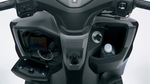Η επίπεδη ποδιά του Burgman είναι πλήρως εκμεταλλεύσιμη και για τη μεταφορά αντικειμένων με τη Suzuki να έχει τοποθετήσει πτυσσόμενο γάντζο που ασφαλίζει μπροστά από τη σέλα αλλά και έναν μικρότερο στην περιοχή της ποδιάς. Στην ποδιά δίνουν το «παρών» και δύο ντουλαπάκια, ένα κλειστό που φέρει και φωτιζόμενη θύρα φόρτισης USB και ένα ανοιχτό στα δεξιά για τα μικροαντικείμενα στα οποία ο αναβάτης θέλει να έχει άμεση πρόσβαση.