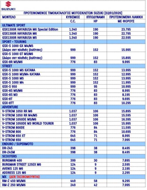 Ο νέος τιμοκατάλογος προσφέρει επιλογές για κάθε μοτοσυκλετιστή, με την αξιοπιστία και την ποιότητα που χαρακτηρίζουν τη Suzuki. Για το 2026, ιδιαίτερη έμφαση δίνεται σε συγκεκριμένα μοντέλα, όπως V-Strom 800DE στα 11.595 ευρώ, το V-Strom 800 στα 10.695 ευρώ και το V-Strom650 XT στα 8.995 ευρώ.