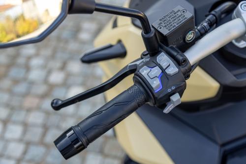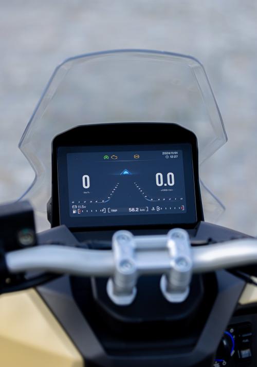 Στον βασικό εξοπλισμό διαθέτει, TFT 7’’, Fat bar τιμόνι, ρυθμιζόμενη ζελατίνα, keyless χειρισμός (εκκίνηση, άνοιγμα σέλας και ρεζερβουάρ), χώρος αποθήκευσης κάτω από τη σέλα που χωρά full-face κράνος, καθώς και παροχή USB.