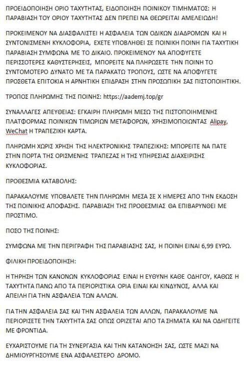 Η εν λόγω απόπειρα εξαπάτησης περιλαμβάνει την αποστολή μέσω μηνύματος στο κινητό τηλέφωνο «μαϊμού» προστίμων, τα οποία αφορούν δήθεν παραβίαση του ορίου ταχύτητας. Μάλιστα στα συγκεκριμένα μηνύματα περιλαμβάνεται σύνδεσμος (link) για άμεση καταβολή ενός χρηματικού ποσού, ενώ γίνονται αναφορές σε ανύπαρκτες διαδικασίες και πλατφόρμες πληρωμών.