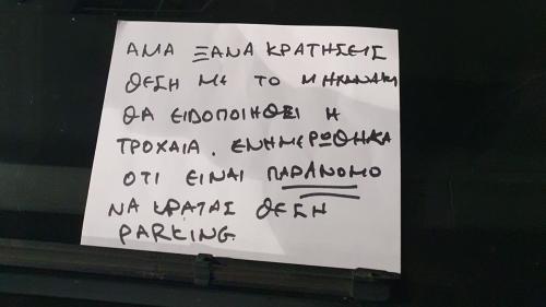 Στο σημείωμα, το οποίο δημοσιεύθηκε στην ομάδα «Είμαι Ελληνάρας, και παρκάρω όπου γουστάρω» αναφερόταν το εξής: «Άμα ξανακρατήσεις θέση με το μηχανάκι θα ειδοποιηθεί η Τροχαία. Ενημερώθηκα ότι είναι παράνομο να κρατάς θέση πάρκινγκ».