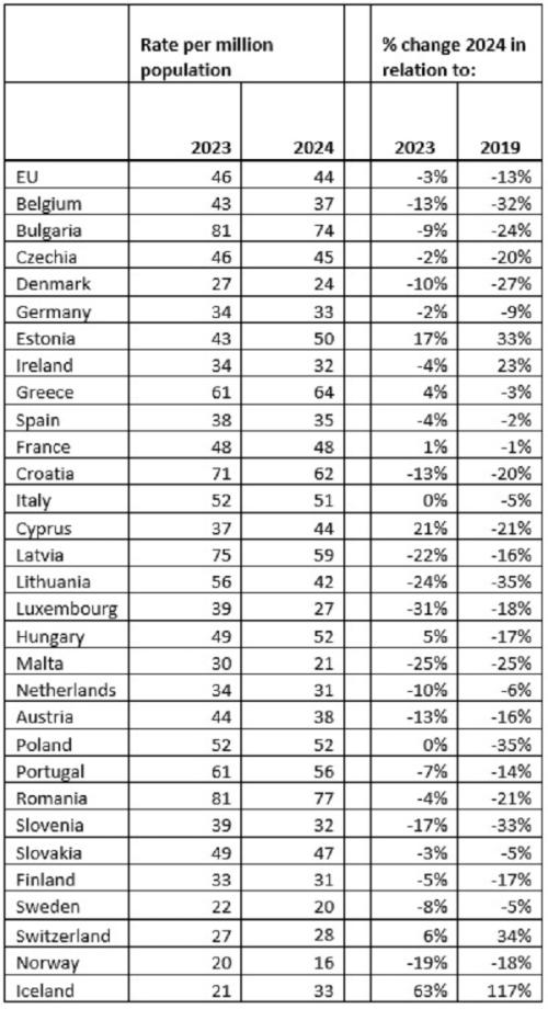 Ο μέσος όρος των κρατών μελών της ΕΕ σε νεκρούς ανά εκατομμύριο πολίτες το 2024 ανήλθε σε 44 άτομα έναντι 46 πολιτών το 2023 σημειώνοντας πτώση 13%.