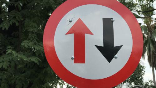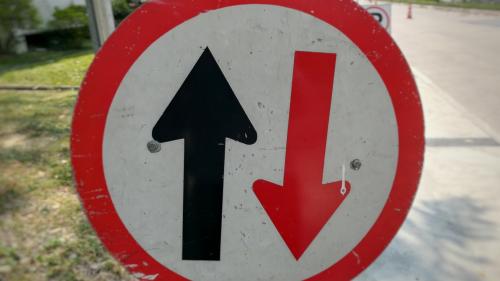 Μία από αυτές είναι η κυκλική πινακίδα με κόκκινο περίγραμμα και το λευκό φόντο, στην οποία εμφανίζονται δύο αντίρροπα βέλη, ένα μαύρο που δείχνει προς τα επάνω και ένα κόκκινο που δείχνει προς τα κάτω.
