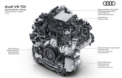 Μεγάλη τεχνική καινοτομία αποτελεί ο συνδυασμός του MHEV plus με διπλή υπερτροφοδότηση, πράγμα που βλέπουμε πρώτη φορά σε κινητήρα Audi. Αυτή η αρχιτεκτονική επιτρέπει στον V6 TDI να εξαλείψει σχεδόν εντελώς το turbo lag. Από στάση επεμβαίνει το PTG ενώ στη συνέχεια ο ηλεκτρικός συμπιεστής προσφέρει άμεσα συμπιεσμένο αέρα, ακόμη και όταν τα καυσαέρια δεν επαρκούν για να γυρίσουν την κλασική τουρμπίνα.