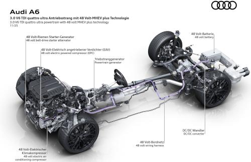 Η τεχνολογία MHEV plus 48 Volt που παρουσιάστηκε στο νέο Audi A5 και τώρα περνά στα A6 και Q5, ανεβάζει τον εξηλεκτρισμό των θερμικών κινητήρων σε… άλλο επίπεδο. Το σύστημα ενσωματώνει νέο powertrain generator (PTG), που προσφέρει ηλεκτρική κίνηση σε χαμηλές ταχύτητες, συνεισφορά έως 24 ίππων και 230 Nm, ανάκτηση ενέργειας έως 25 kW και τέλος, μείωση κατανάλωσης και εκπομπών ρύπων έως 15% σε σχέση με τους προηγούμενους V6 TDI. Το PTG τροφοδοτείται από μια μπαταρία LFP 1,7 kWh, βελτιστοποιημένη για γρήγορους κύκλους φόρτισης/εκφόρτισης.