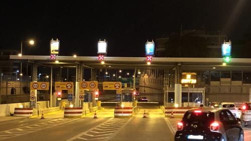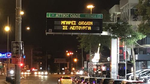 Λίγο πριν εισέλθουμε στον αυτοκινητόδρομο στην φωτεινή επιγραφή που είχε τοποθετηθεί πριν την είσοδο στην Αττική Οδό η διαχειρίστρια εταιρεία ενημέρωνε τους οδηγούς: «Δωρεάν ΙΧ και Δίκυκλα – Μπάρες διοδίων σε λειτουργία».