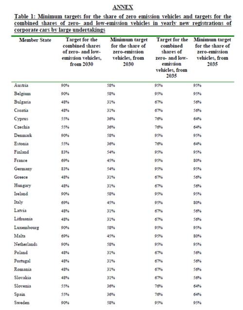 Το υψηλότερο ποσοστό αμιγώς ηλεκτρικών εταιρικών αυτοκινήτων το 2030 το οποίο ανέρχεται σε 58% έχουν Αυστρία, Βέλγιο Δανία, Ιρλανδία, Λουξεμβούργο, Ολλανδία και Σουηδία.